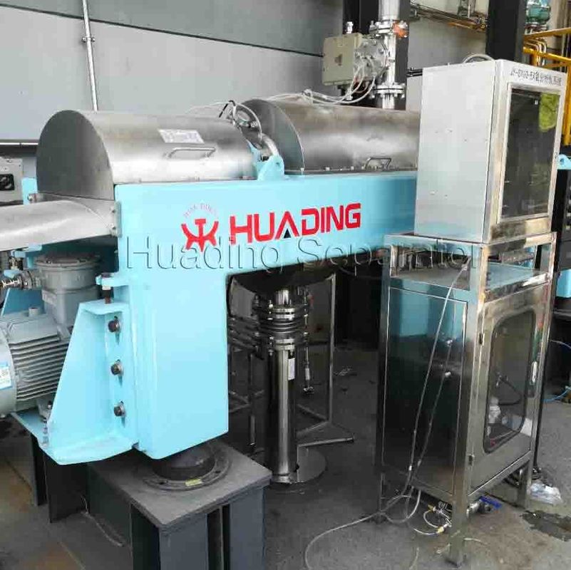 Incluye un cuenco, un transportador de tornillo dispuesto en el cuenco, un diferencial y una tubo de alimentación dispuestos en ambos extremos del cuenco y los utilizó conjuntamente con el transportador de tornillo, y está situado en los asientos que llevan en ambos extremos del cuenco. Se proporciona un anillo del carbono, un puerto de relleno del nitrógeno del anillo del carbono se proporciona en el anillo del carbono, un puerto de relleno del nitrógeno de la cubierta se proporciona en ambos extremos y la parte inferior de la cubierta fuera del cuenco, y un puerto del alivio de presión de la cubierta se proporciona en la parte superior de la cubierta. La cantidad de nitrógeno cargada en el modelo para uso general durante la separación grandemente se reduce comparada con las centrifugadoras ordinarias de la jarra, y el contacto entre la alimentación y el aire se aísla bien, y se alcanza el efecto a prueba de explosiones.